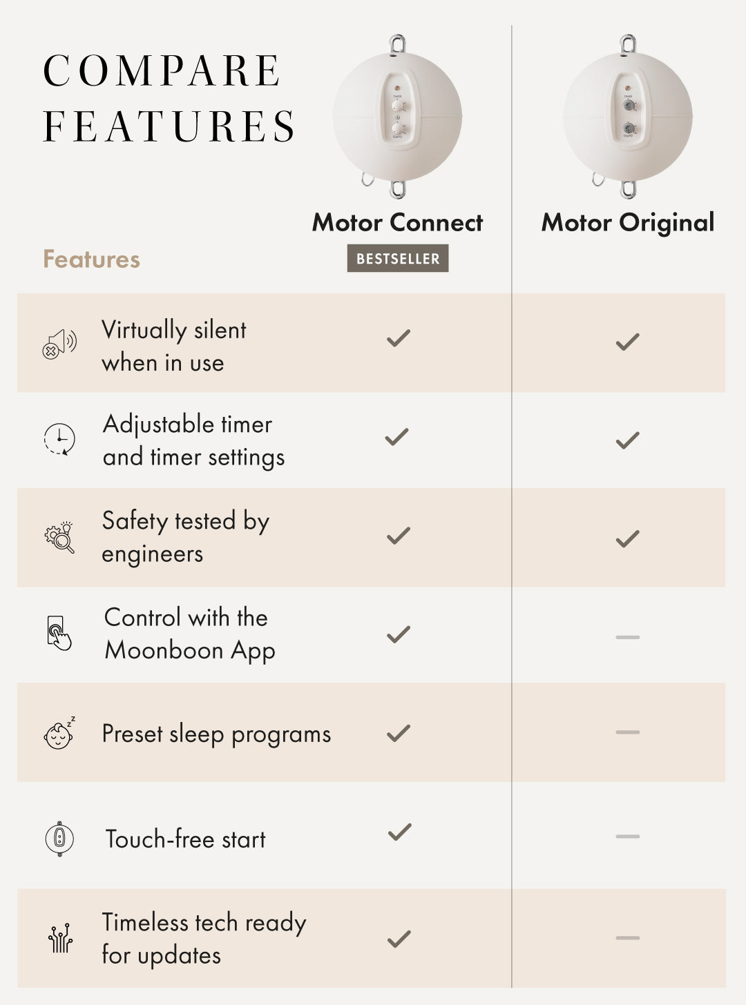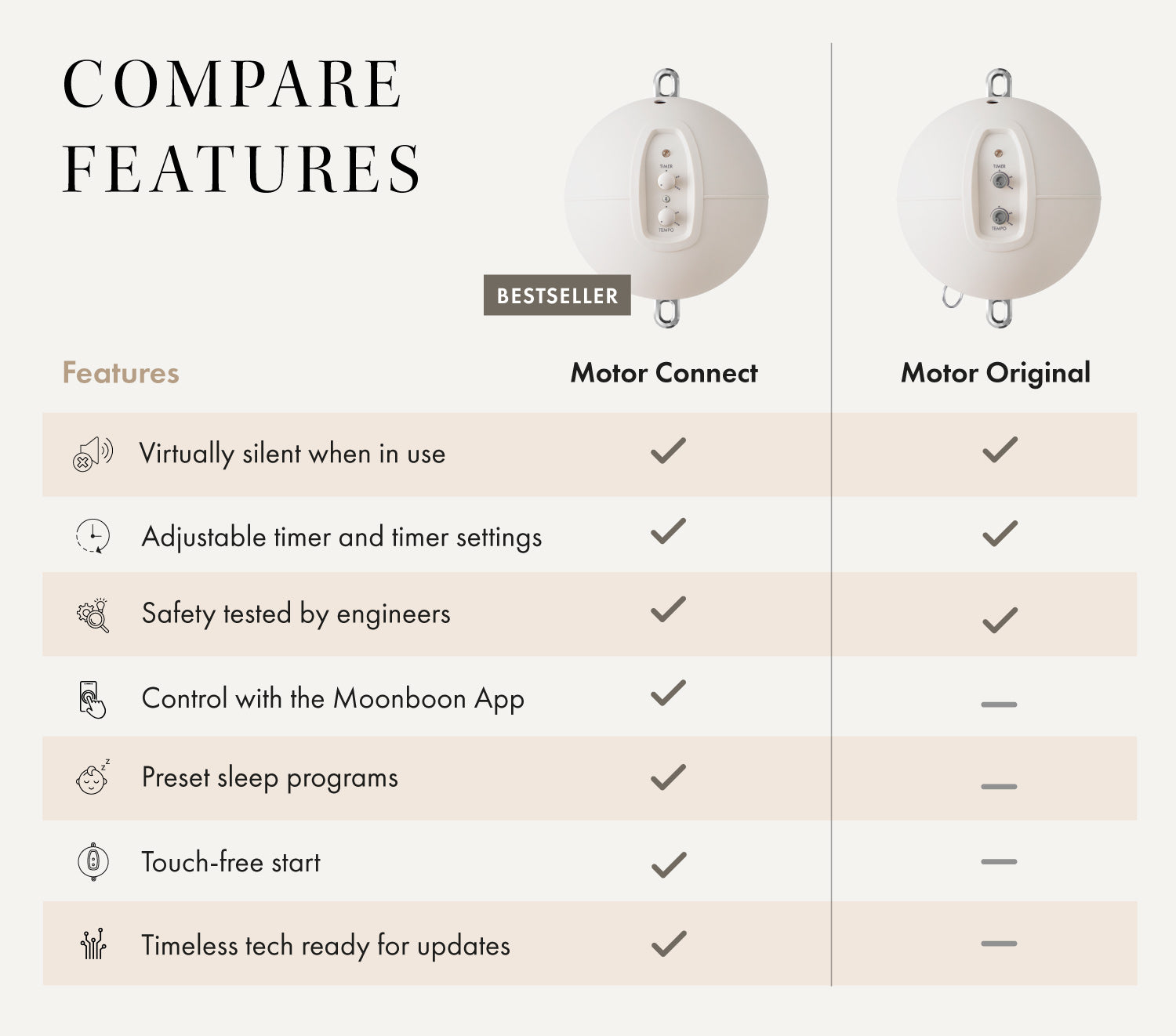 Rocking should be introduced gently and slowly – either manually or with our Moonboon Motor. You can gradually increase the tempo and duration of rocking as your baby gets used to it. You’ll soon learn what works for you.